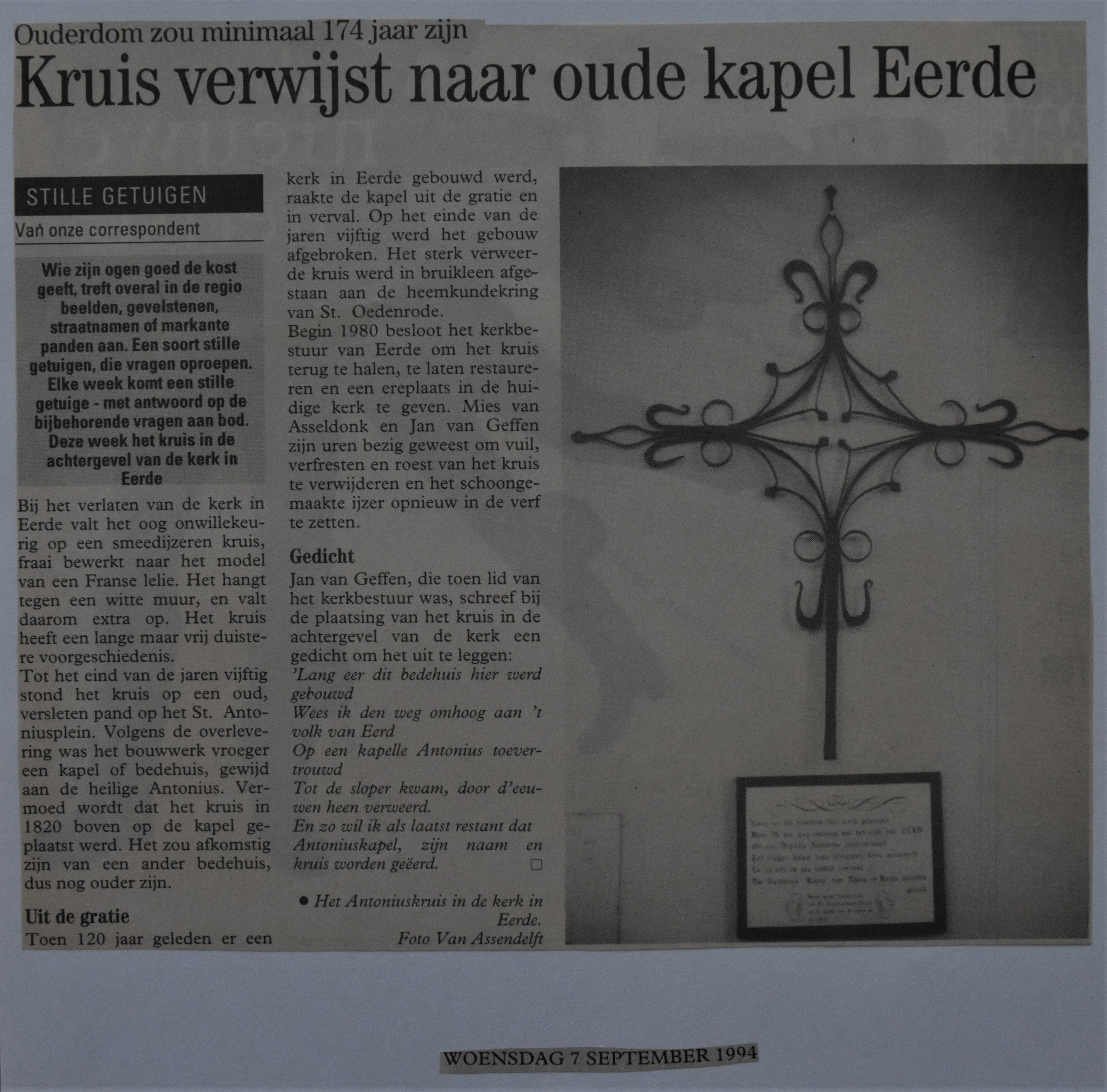 En zo wil ik als laatste restant dat Antoniuskapel, zijn naam en kruis worden geëerd (haan op het kruis). De Sint Antoniuskapel, het eerste bedehuis van Eerde.'