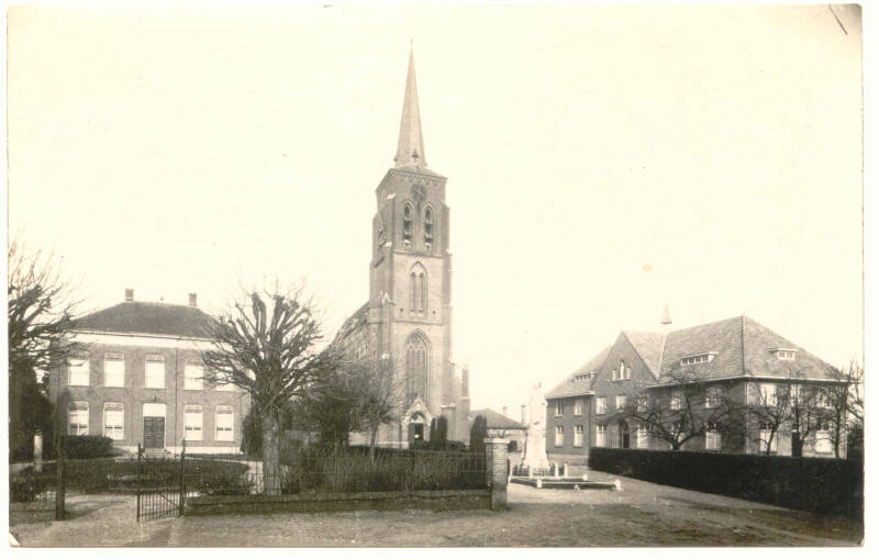 Pastorie, kerk, klooster en Heilig Hartbeeld, omstreeks 1930.