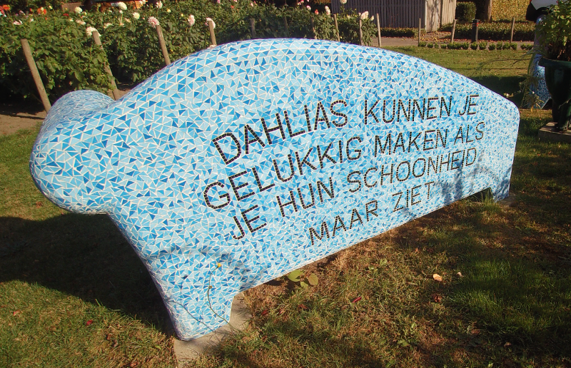 Er staat een prachtig bankje van mozaïek bij de tuin van Dahliavereniging De Pompon. Het was de wens van een overleden lid van de vereniging die iets wilde nalaten aan de vereniging. Het werd een bankje belegd met prachtig mozaïek. Het is een heel mooi plekje om te genieten, even stil te staan en de rust te vinden. In het seizoen is het genieten van alle bloemen met haar prachtige kleuren. En daarmee staat dit bankje op een bijzondere locatie in Eerde.....