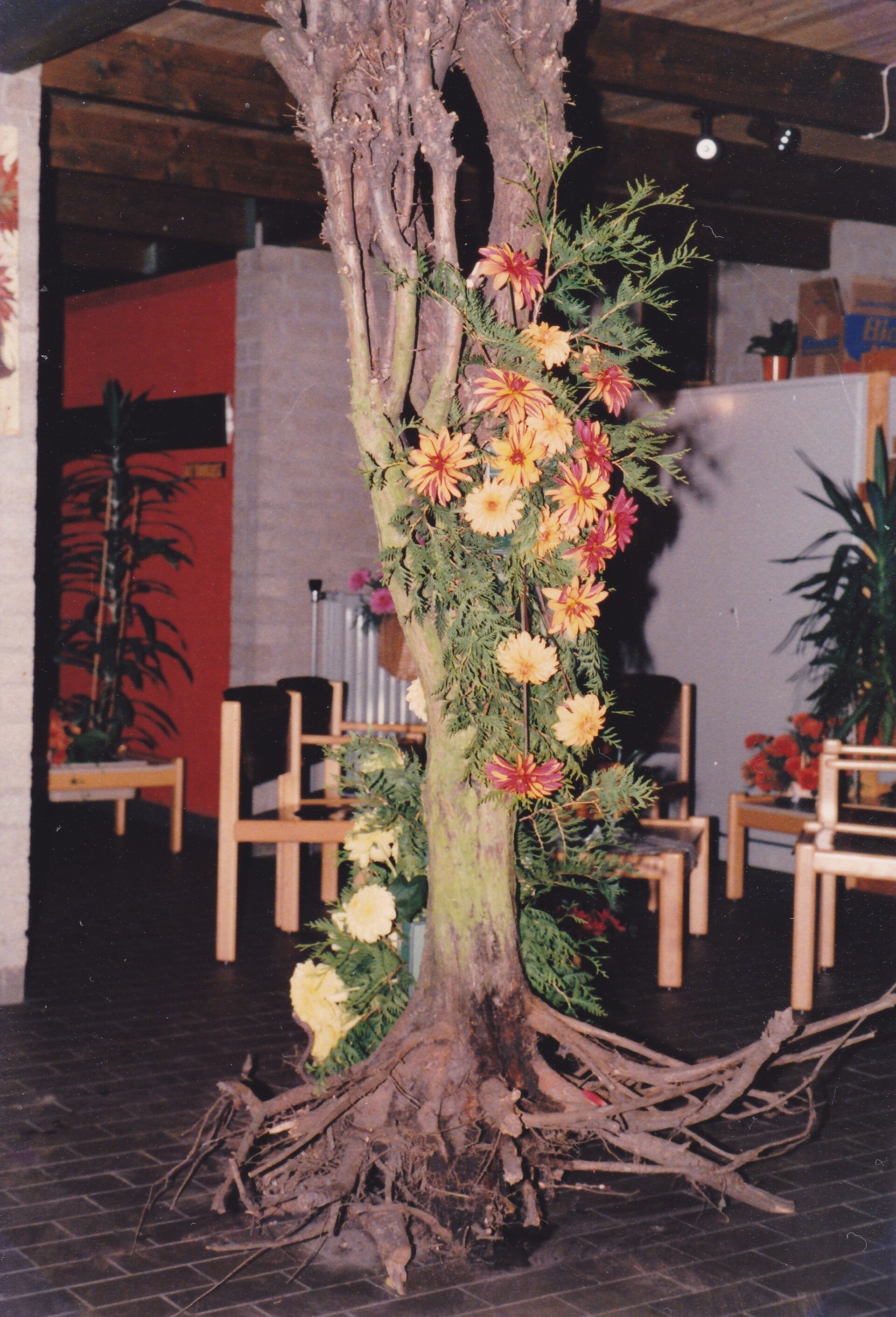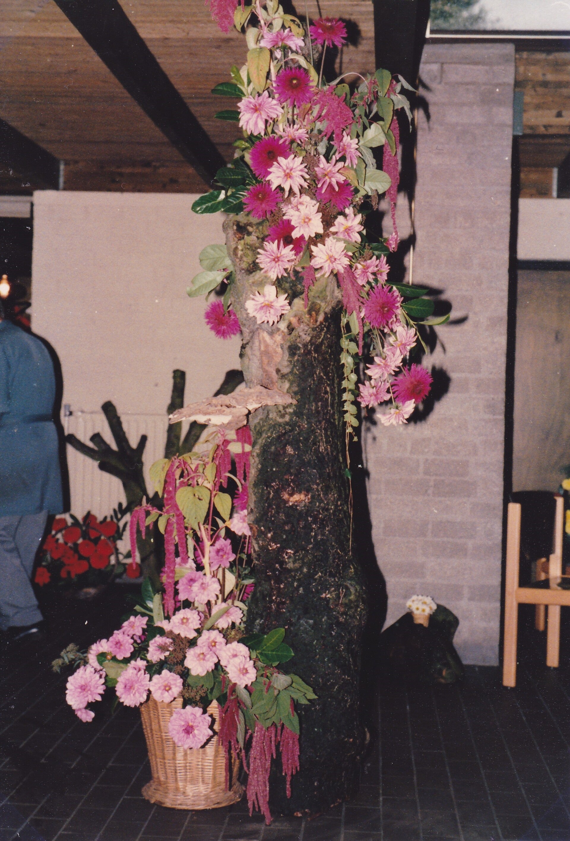 Ook binnen werd de kerk versierd voor het gouden priesterjubileum van pastor Harrie Hamers. Rika van Aarle (links) assisteert vaak de dahliavereniging met het maken van mooie creaties. Verder op de foto: Annie van der Burgt-Dobbelsteen (midden) en Dini van Aarle-van der Heijden (rechts), mei 2001.