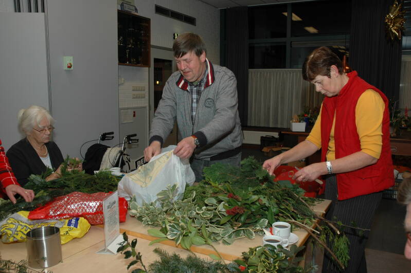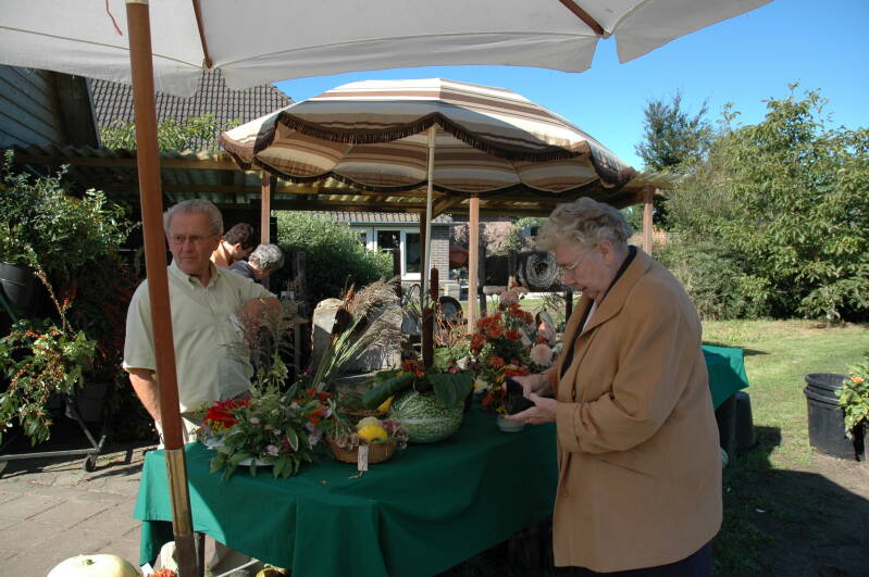 Tijdens de open dag worden er bloemstukjes verkocht om de kas te spekken. V.l.n.r.: Frans van Berkel en Corrie van de Burgt-van der Zanden, 18 september 2005.
