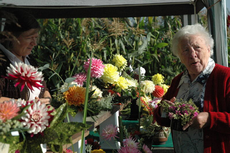 Leden van de dahliavereniging achter de bloemenkraam tijdens de open dag. V.l.n.r.: Christien Ketelaars-van der Burgt en Mien Fassbender-van Grinsven, 16 september 2007.