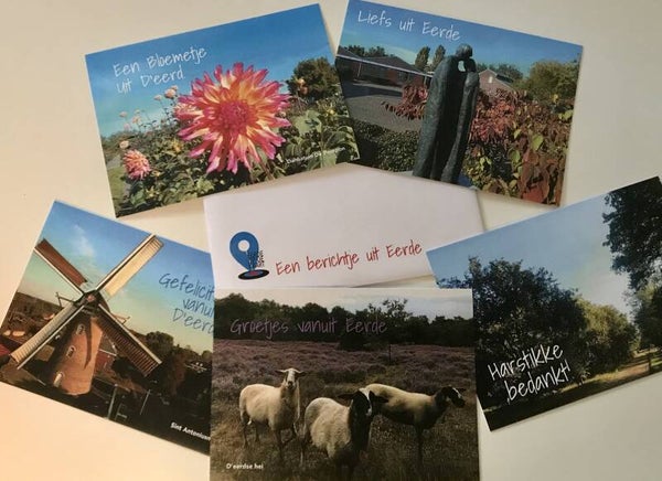 Set van 5 kaarten met diverse plaatjes uit Eerde. Met de aankoop van deze set steunt u Eerde op de kaart. Met de opbrengst kunnen we Eerde op de kaart in 'de lucht' houden.